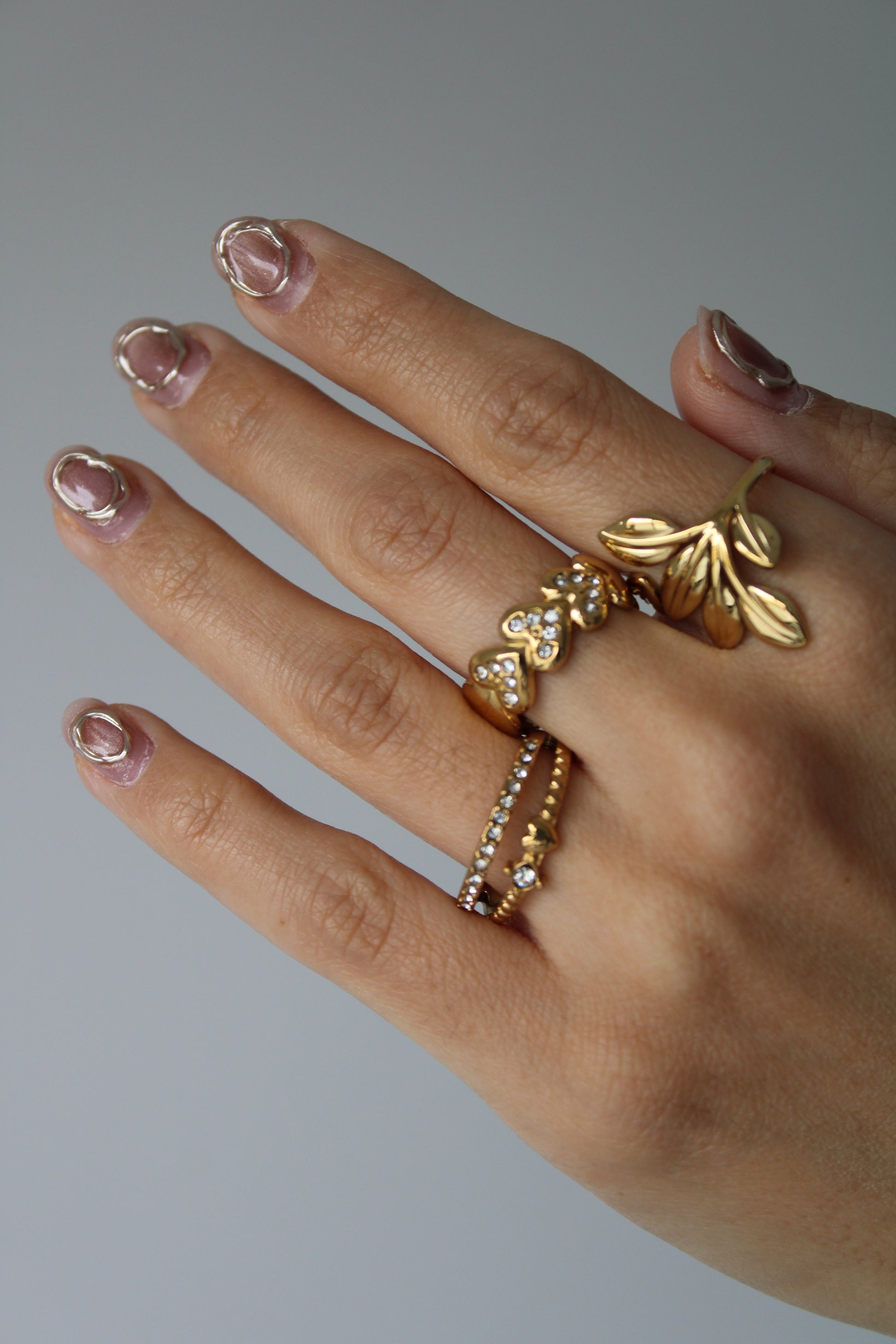 Anillo ajustable de doble banda con detalles de zirconias y un pequeño corazón central.