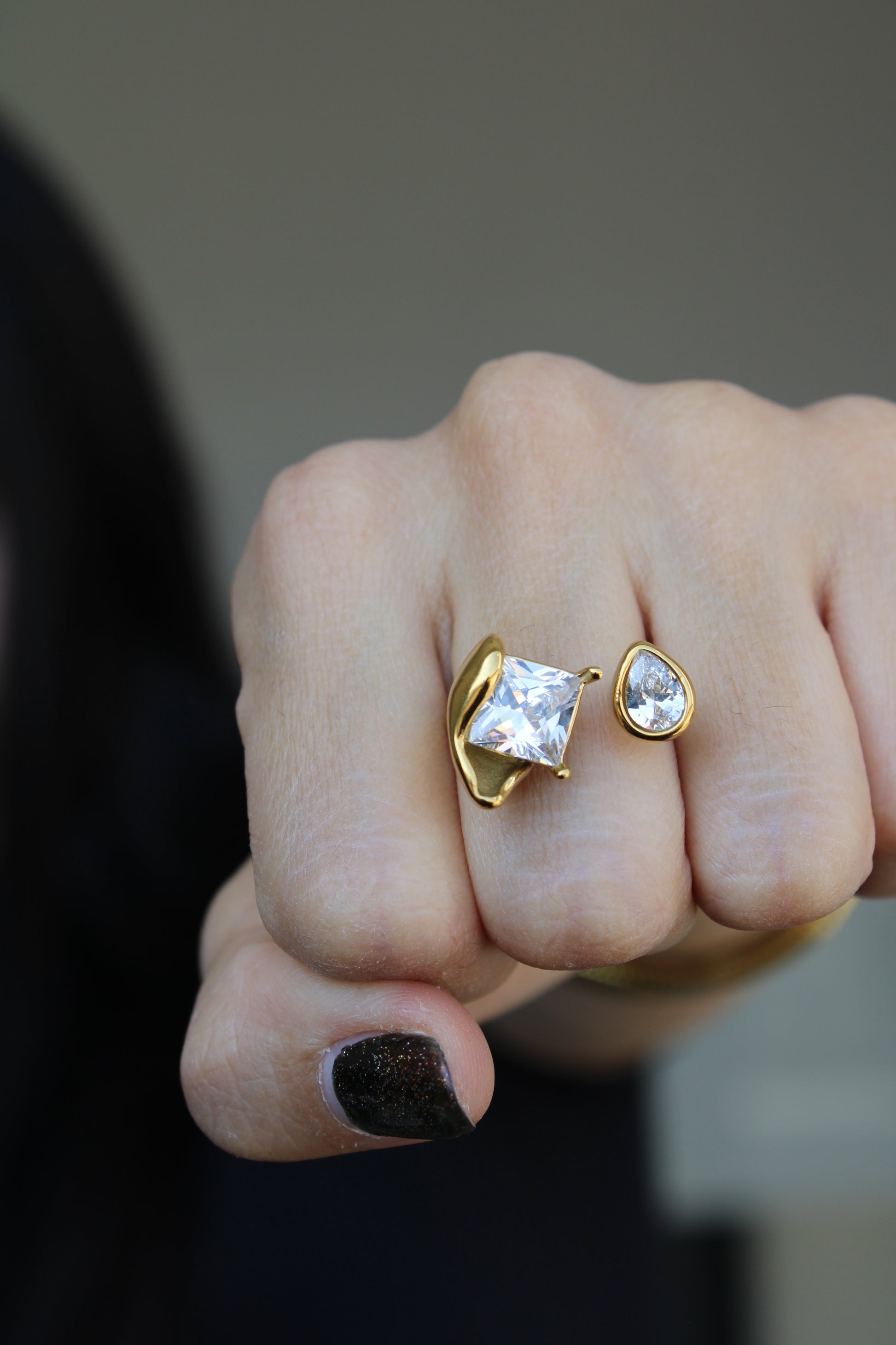 Anillo con diseño ajustable con 2 zirconia cuadrada y de gota.