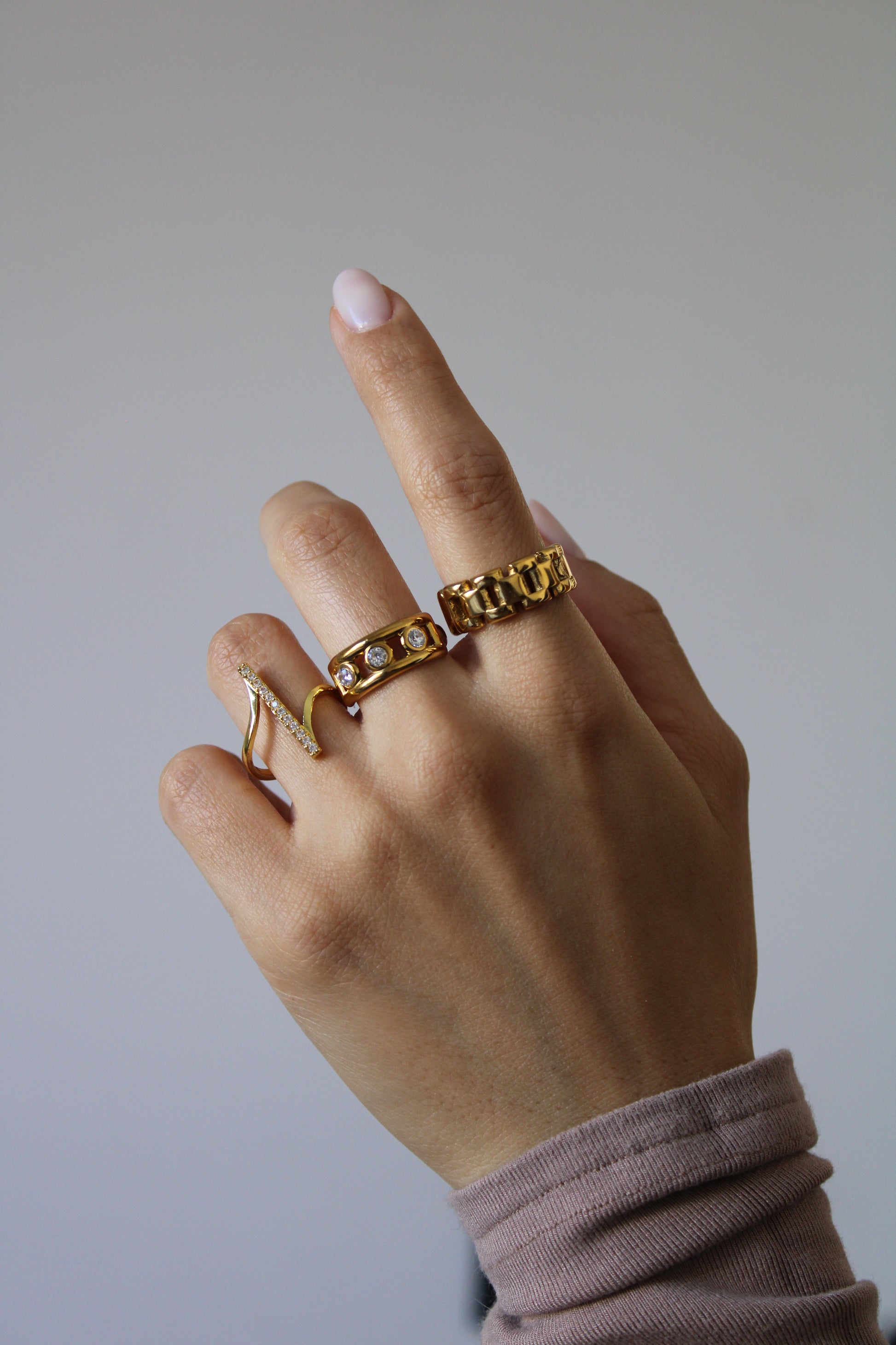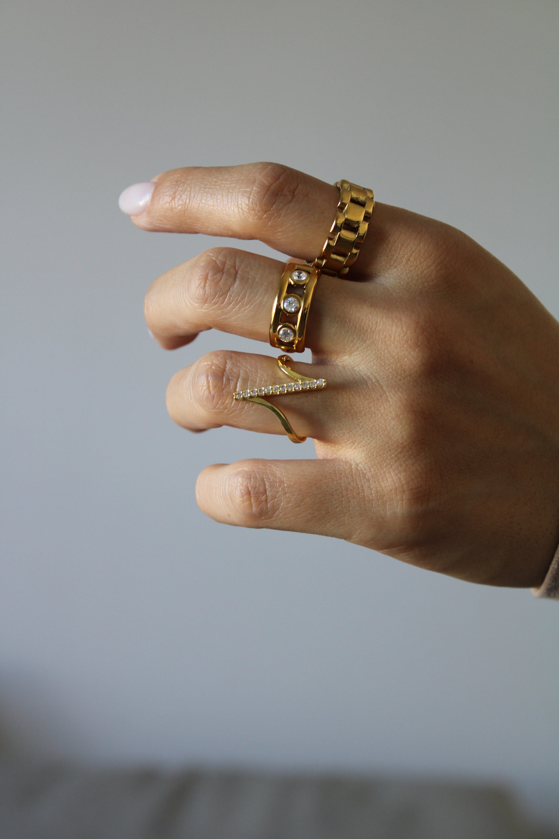 Anillo ajustable con diseño cruzado y tres zirconias circulares al frente.
