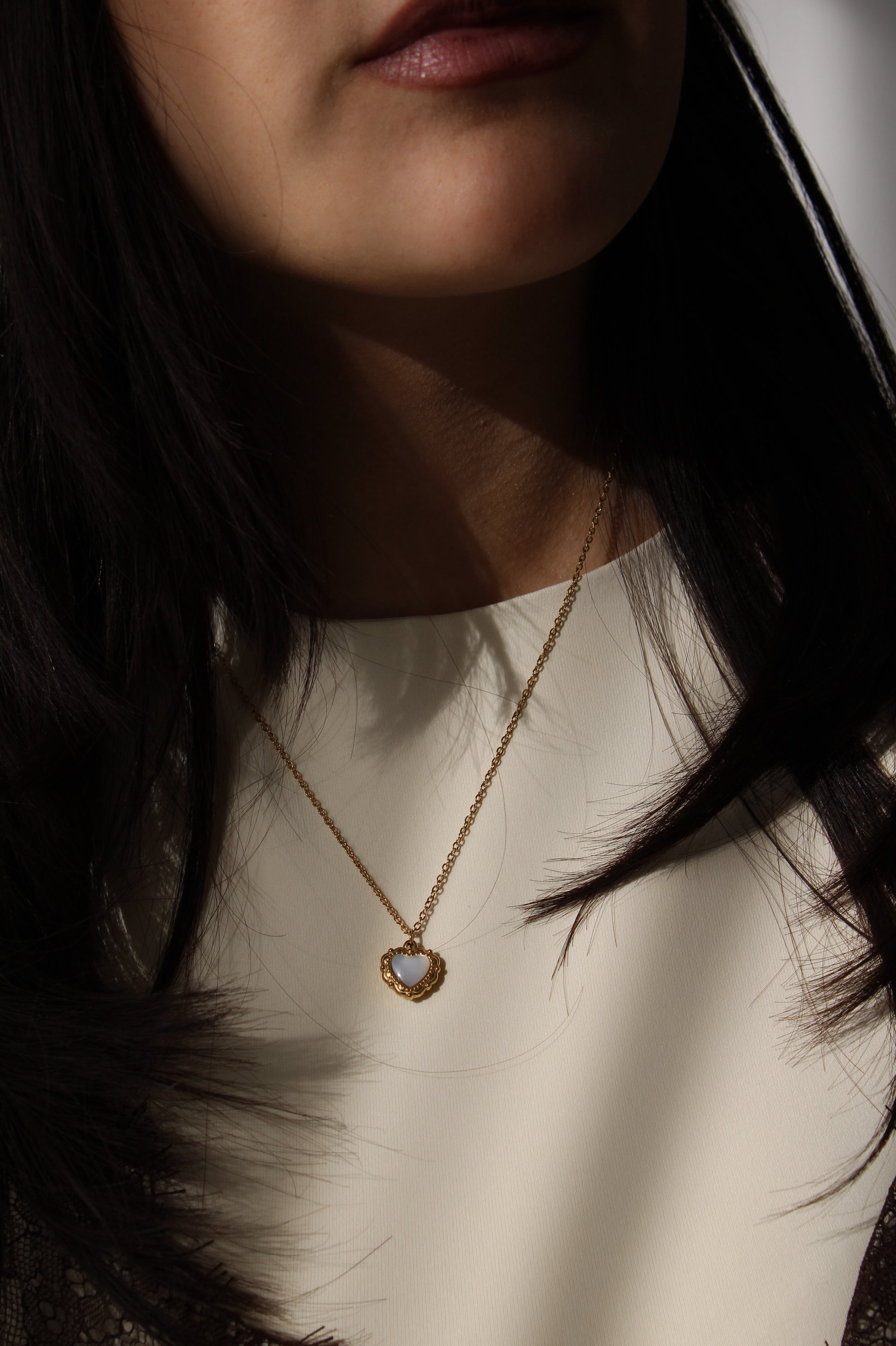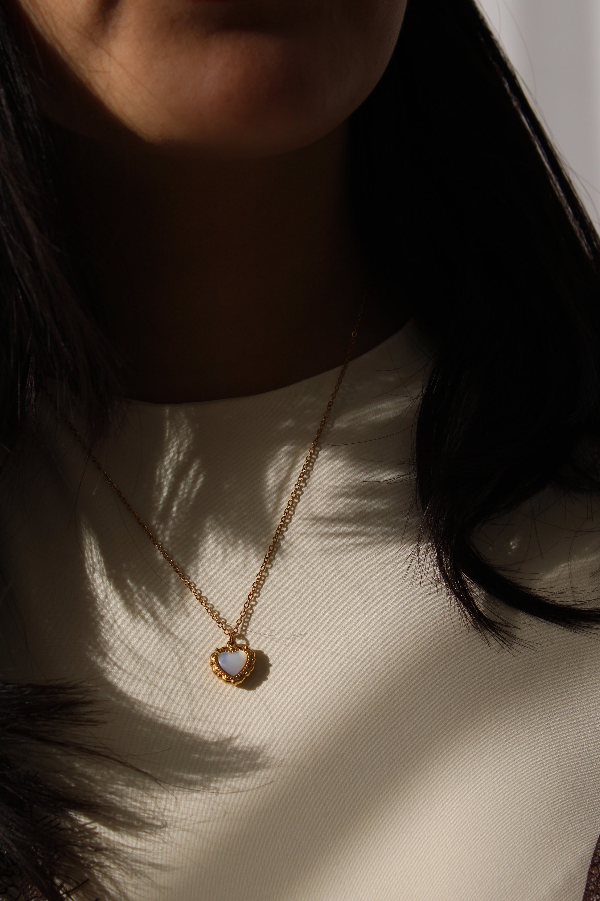 Collar de cadena con dije de corazón con centro tipo concha/nácar y marco dorado. Fabricado en acero inoxidable con baño dorado, resistente y de uso diario.