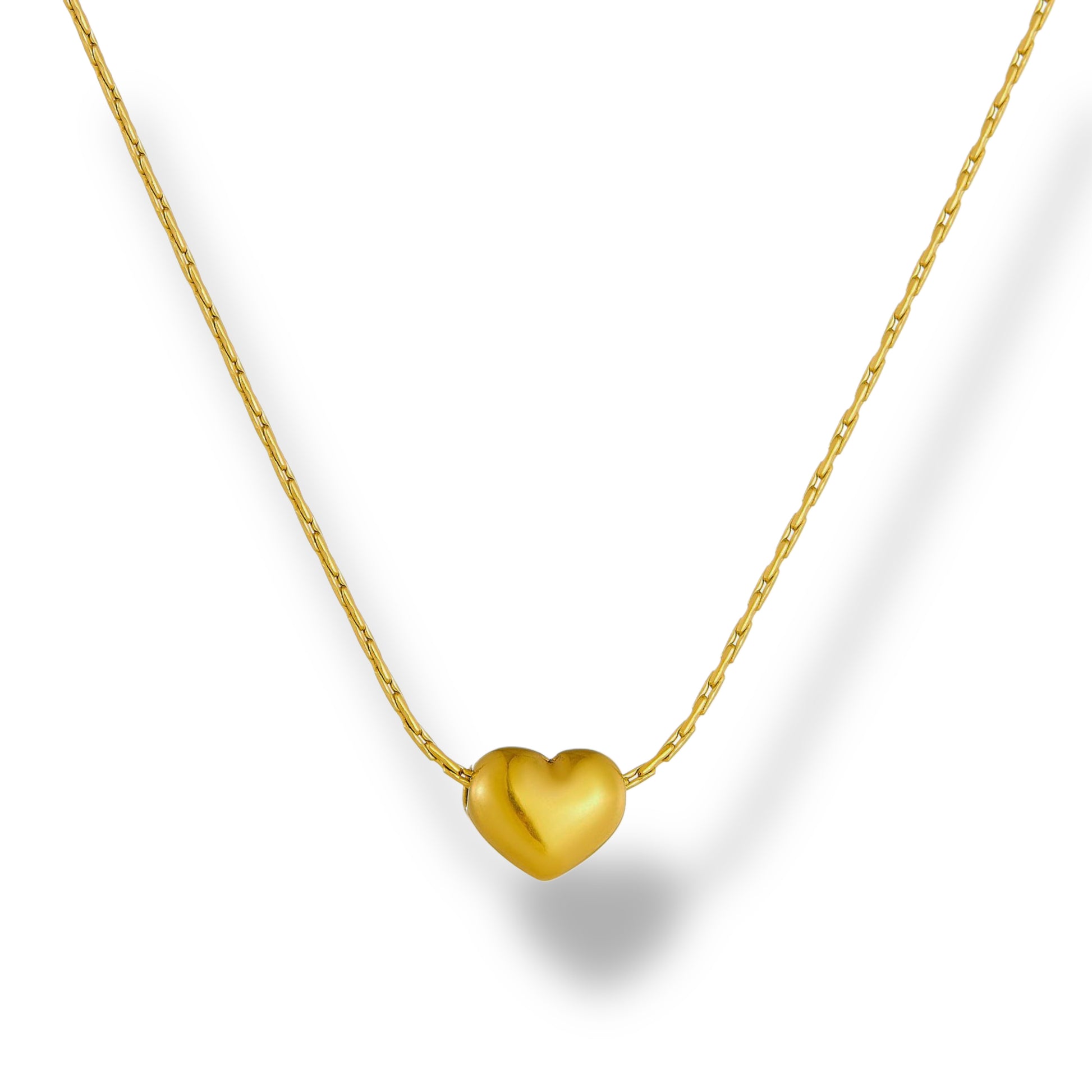 Collar de cadena fina con dije de corazón, disponible en dos tamaños para un efecto delicado y elegante. Fabricado en acero inoxidable; el modelo dorado cuenta con baño PVD, ideal para uso diario por su resistencia y bajo mantenimiento. Perfecto para llevar solo o en layering.