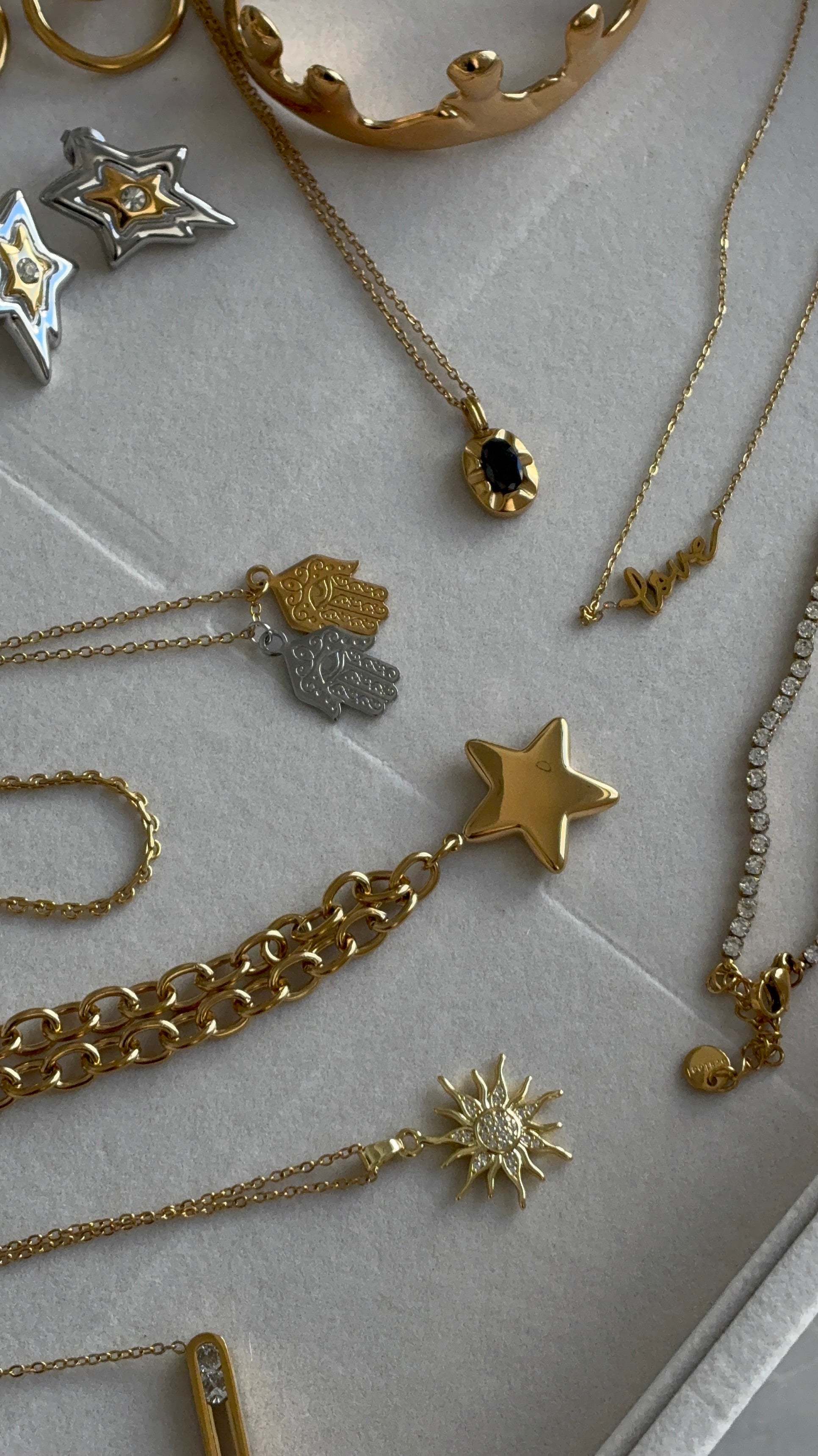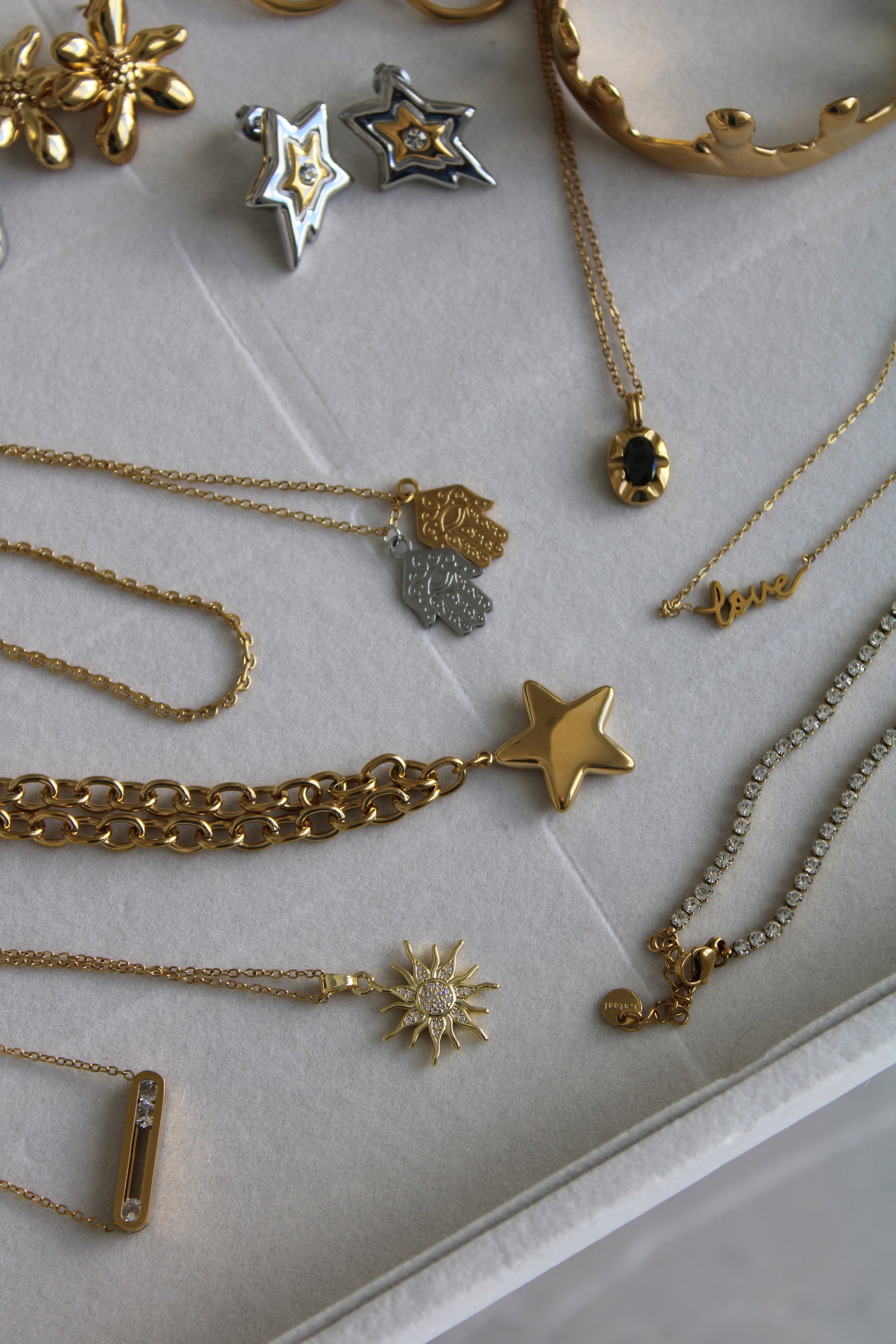 Nuestras joyas están hechas de acero inoxidable 316L, un material premium, duradero y resistente al agua. Las piezas doradas cuentan con un baño de oro PVD de 18 quilates, lo que garantiza un color de larga duración (varios años) y una alta resistencia al desgaste.