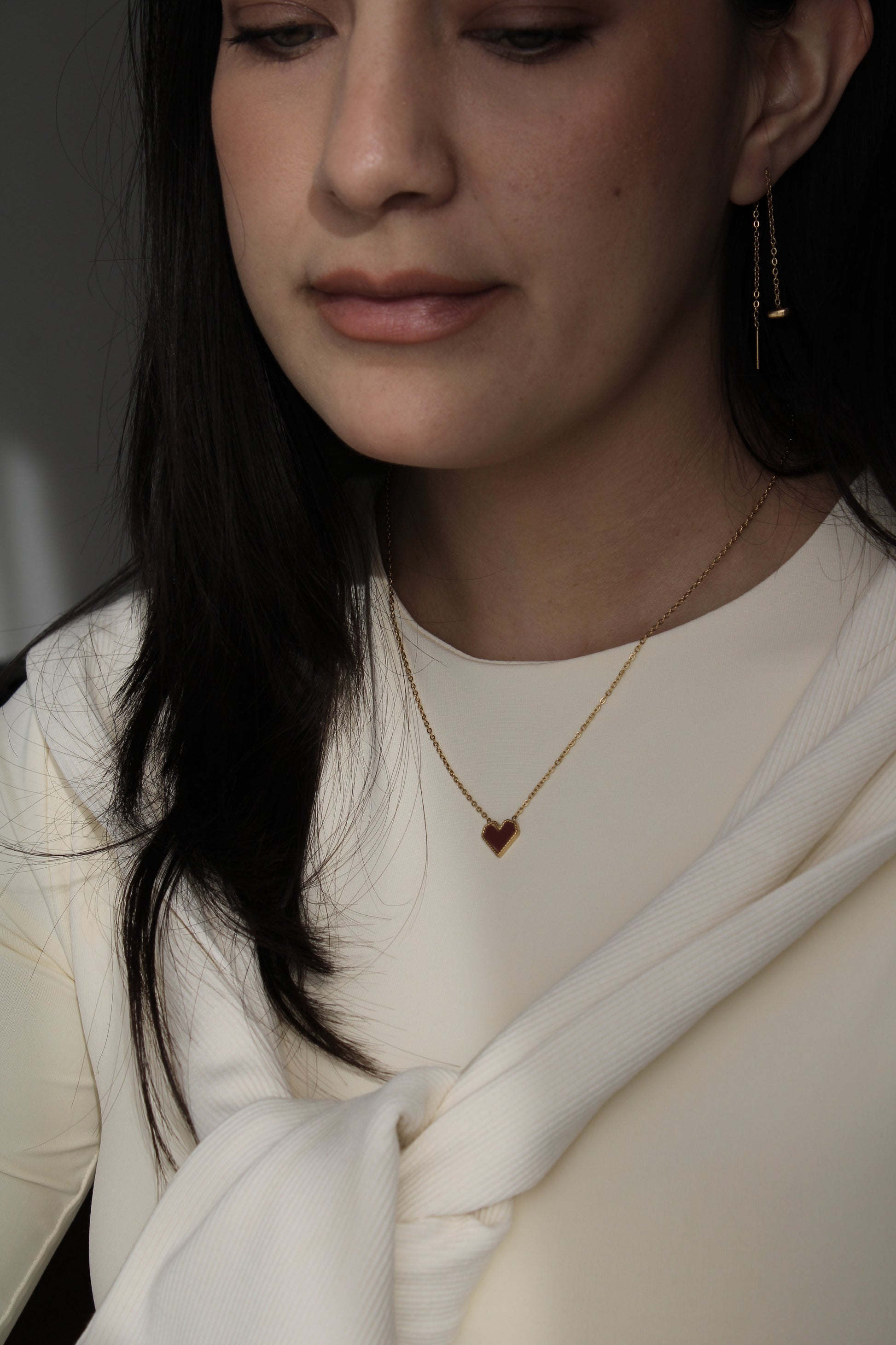 Collar de cadena con dije de corazón en acrílico pintado y marco dorado. Fabricado en acero inoxidable con baño dorado, resistente y de uso diario.