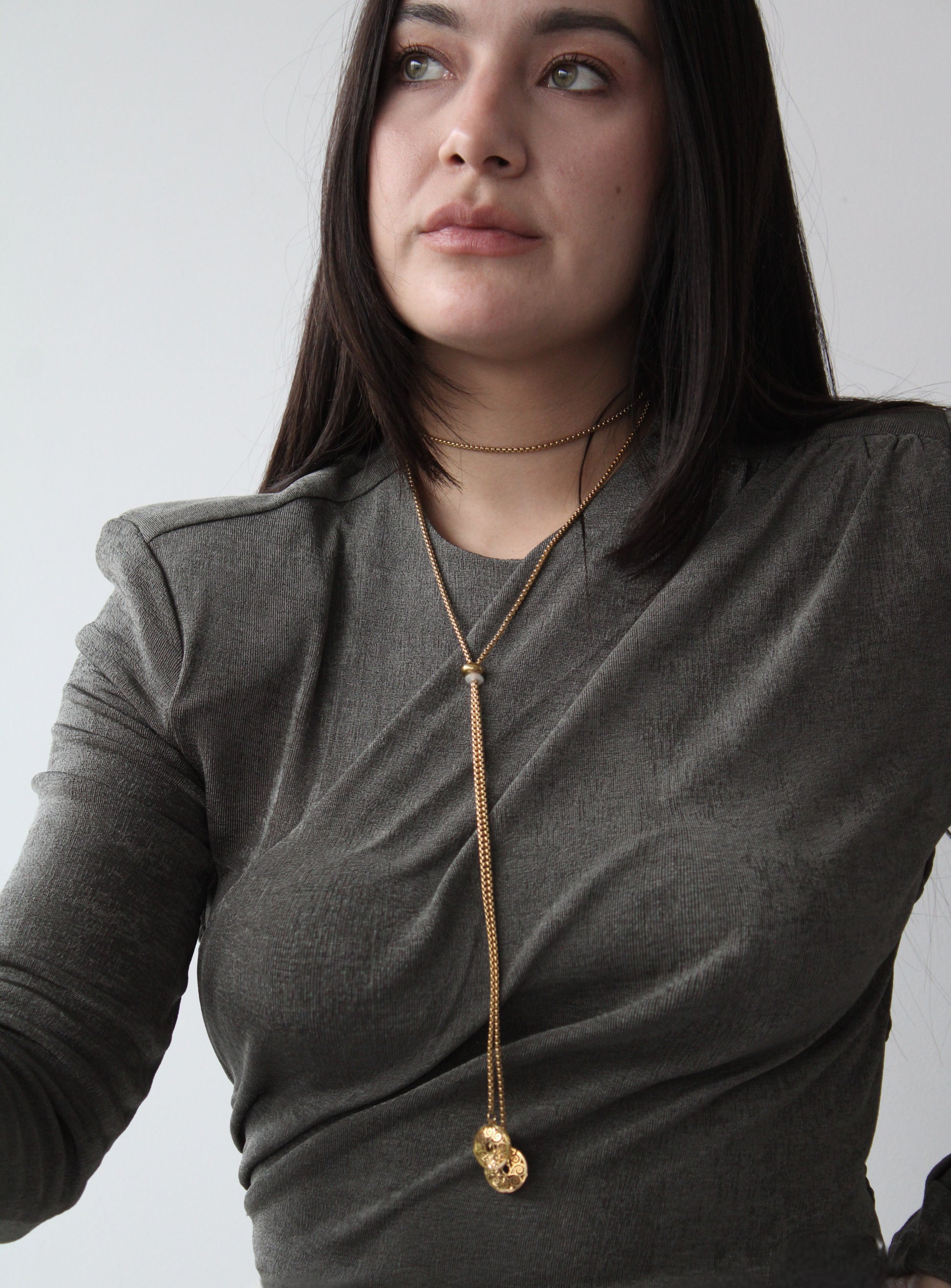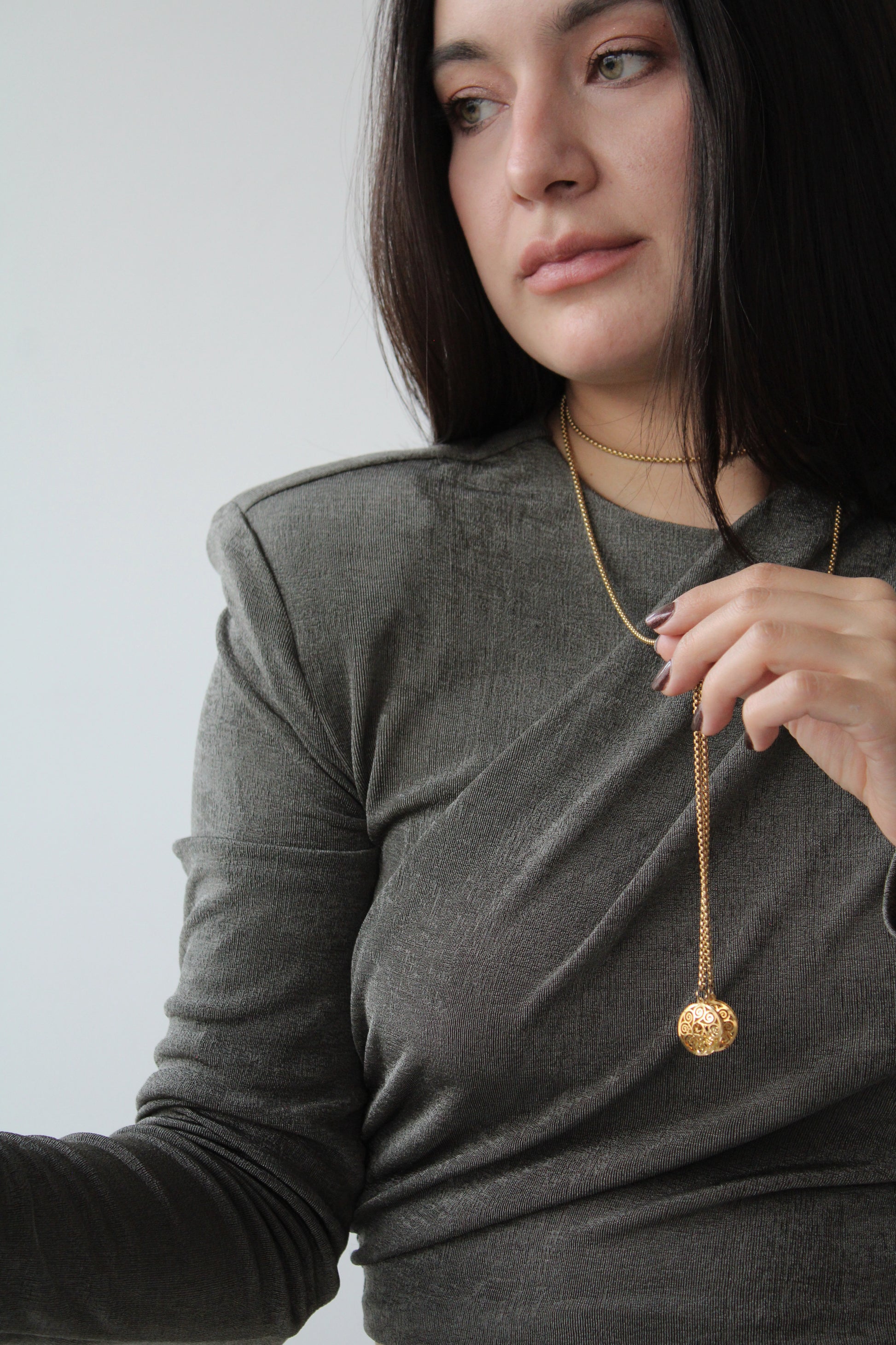 Collar extra largo de 120 cm con cadena dorada y dije doble calado. Una pieza ligera y elegante que estiliza y complementa cualquier look.
