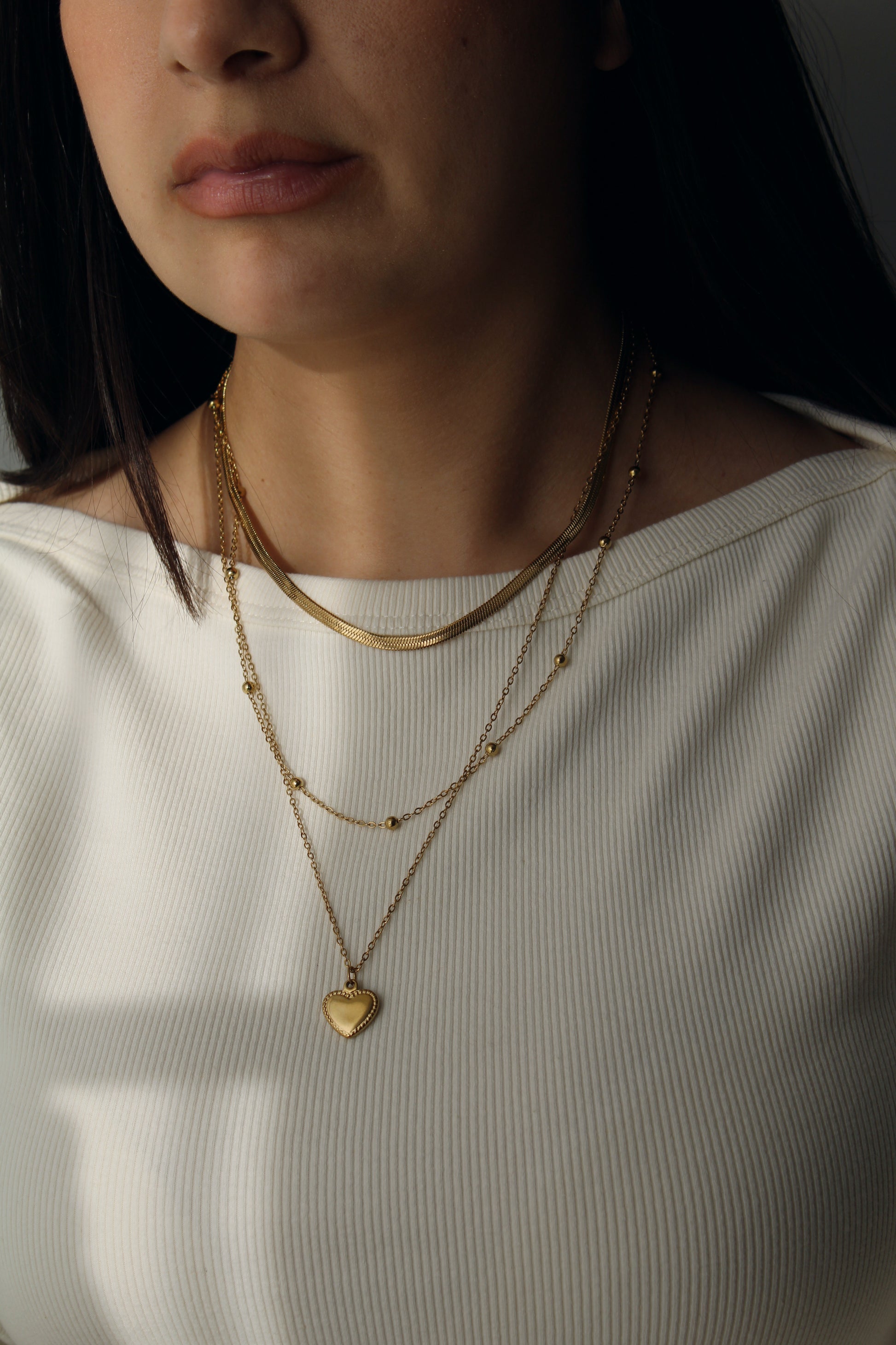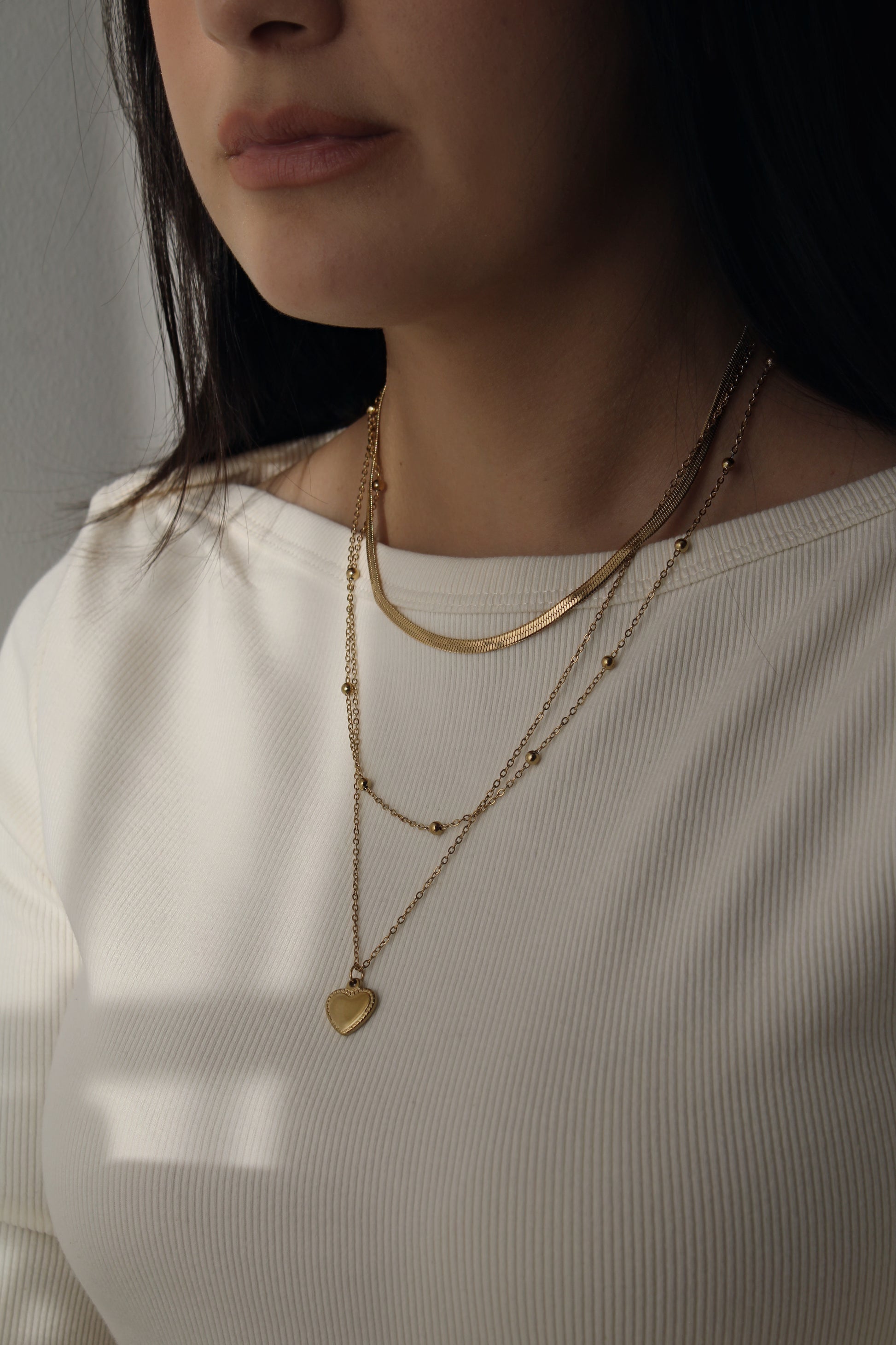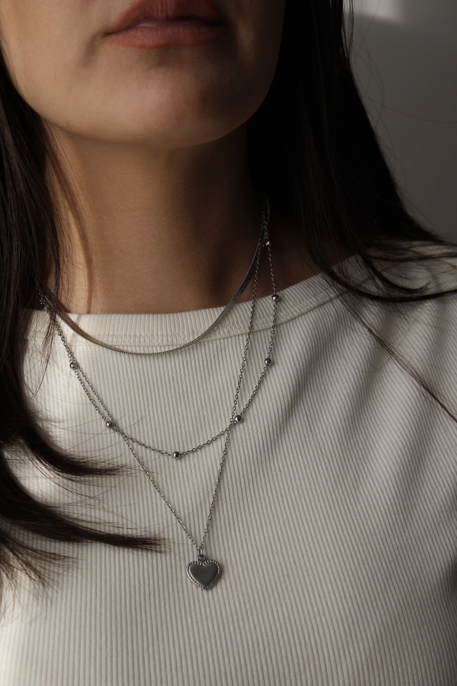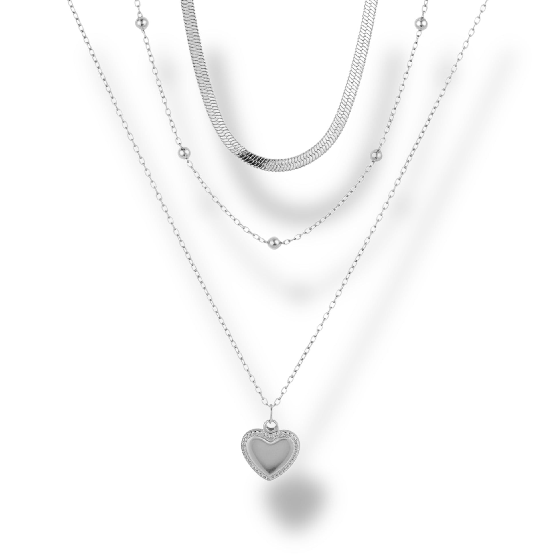 Collar triple de acero inoxidable con dije de corazón.