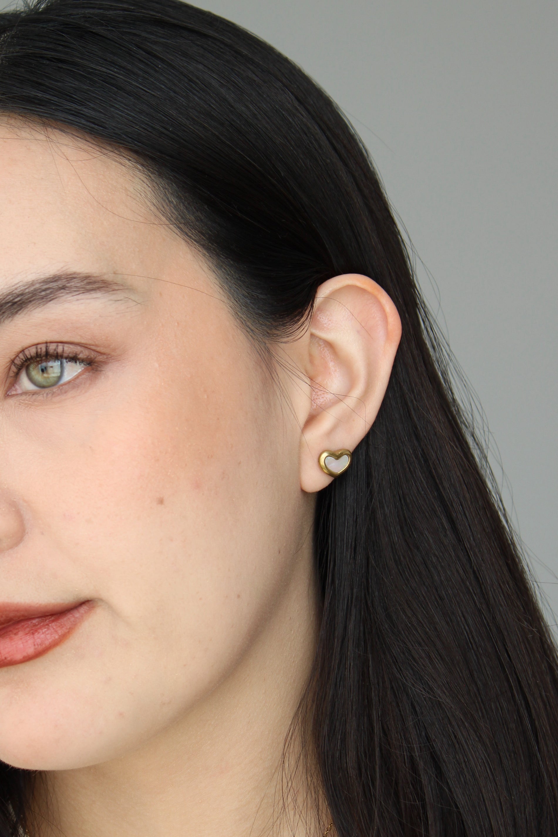 Aretes tipo stud en forma de corazón con centro tipo concha/nácar y marco dorado.