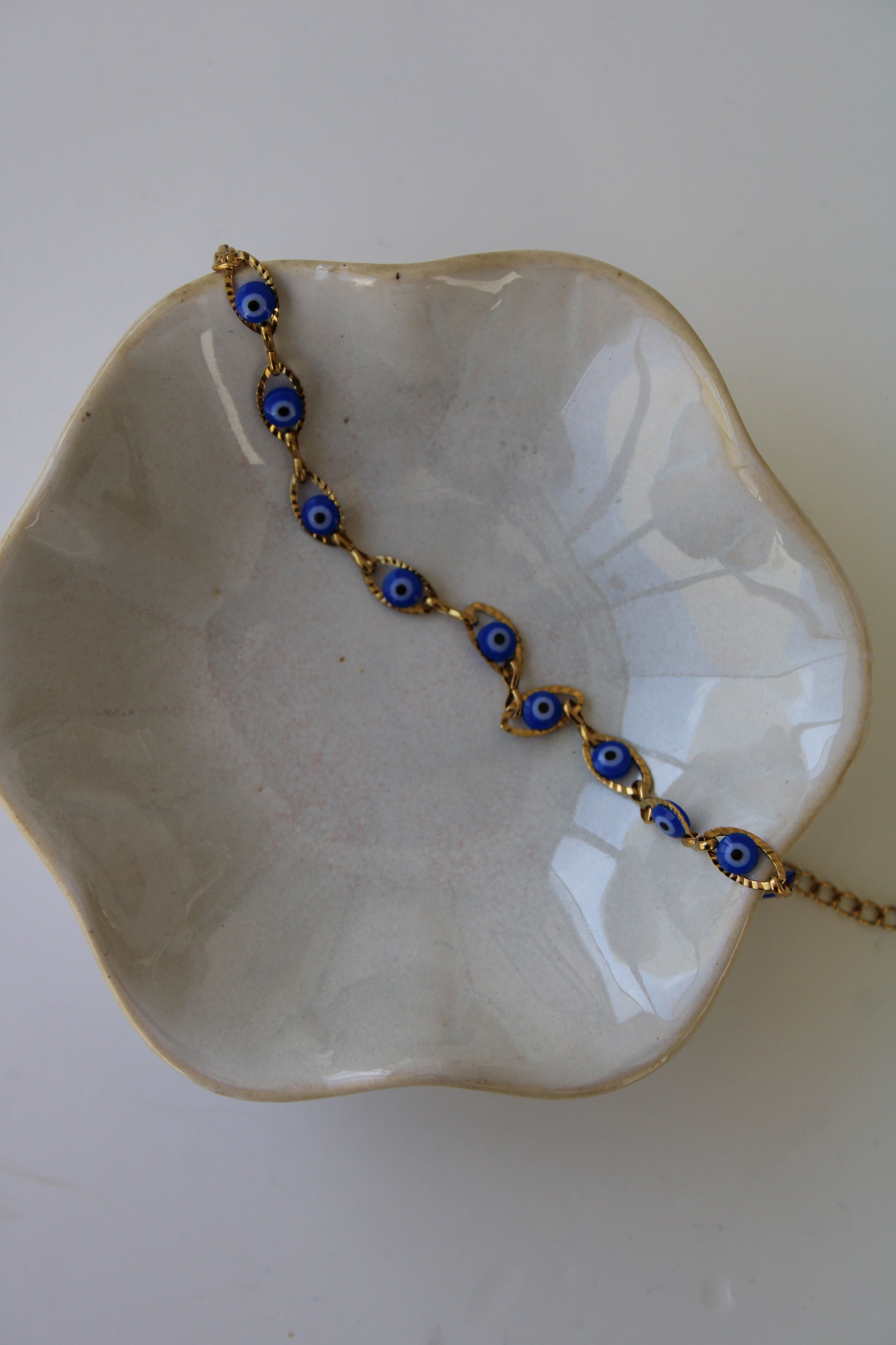 Pulsera delicada con charms de ojo en tonos negro y azul, unidos por eslabones dorados con textura. Un diseño ligero y llamativo, ideal para usar todos los días.