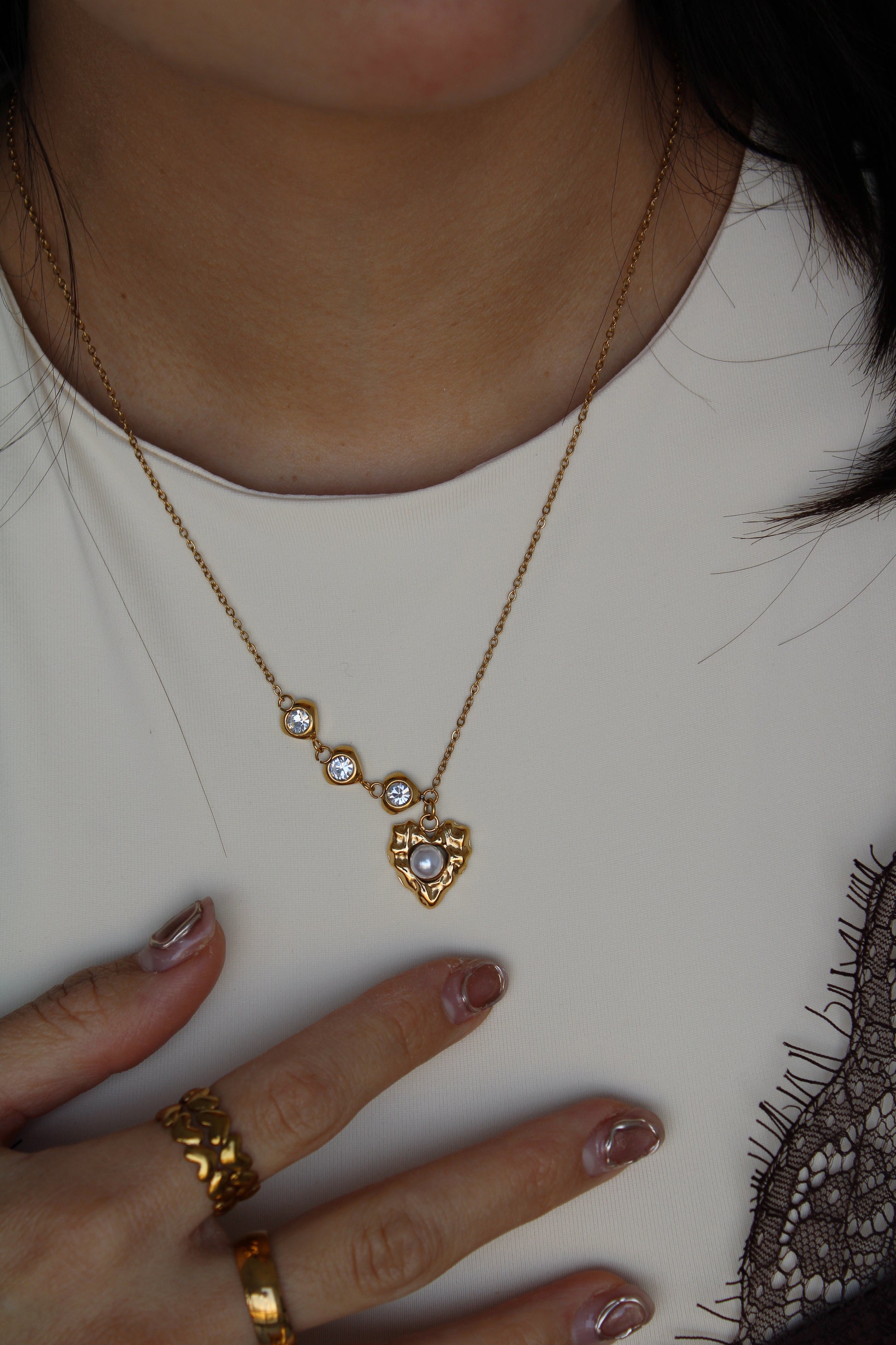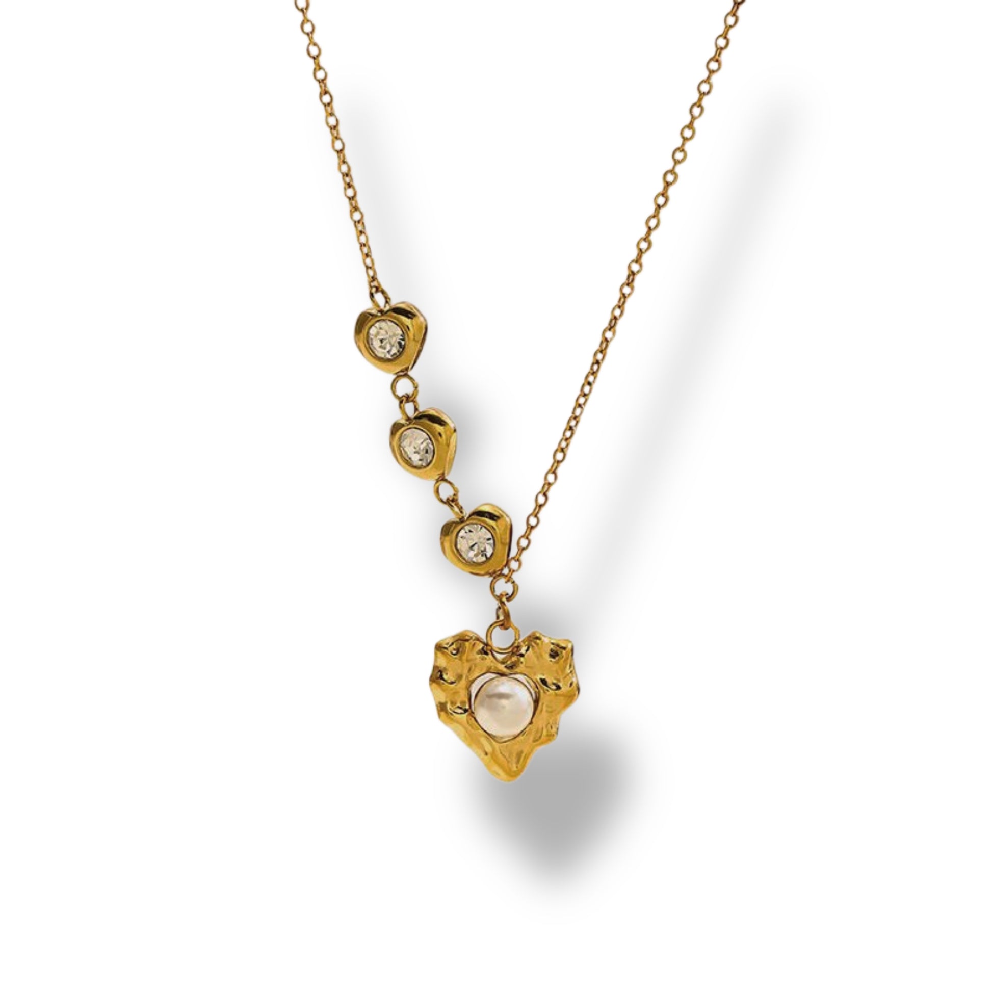 Collar de cadena fina con diseño vertical y dijes con detalle brillante y dije principal orgánico con centro tipo perla. Fabricado en acero inoxidable con baño dorado, resistente y de bajo mantenimiento. Un diseño elegante y especial que eleva cualquier look.